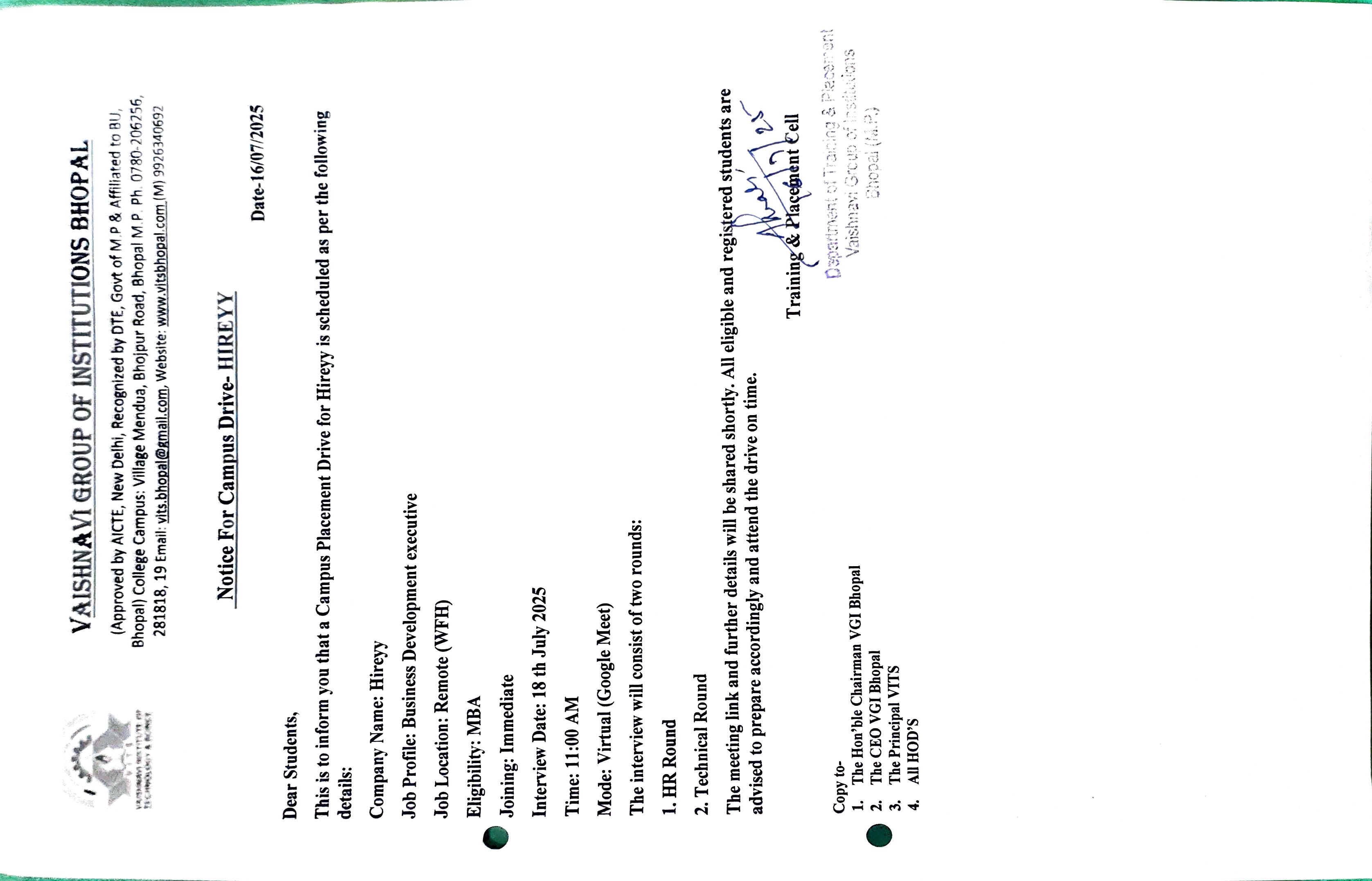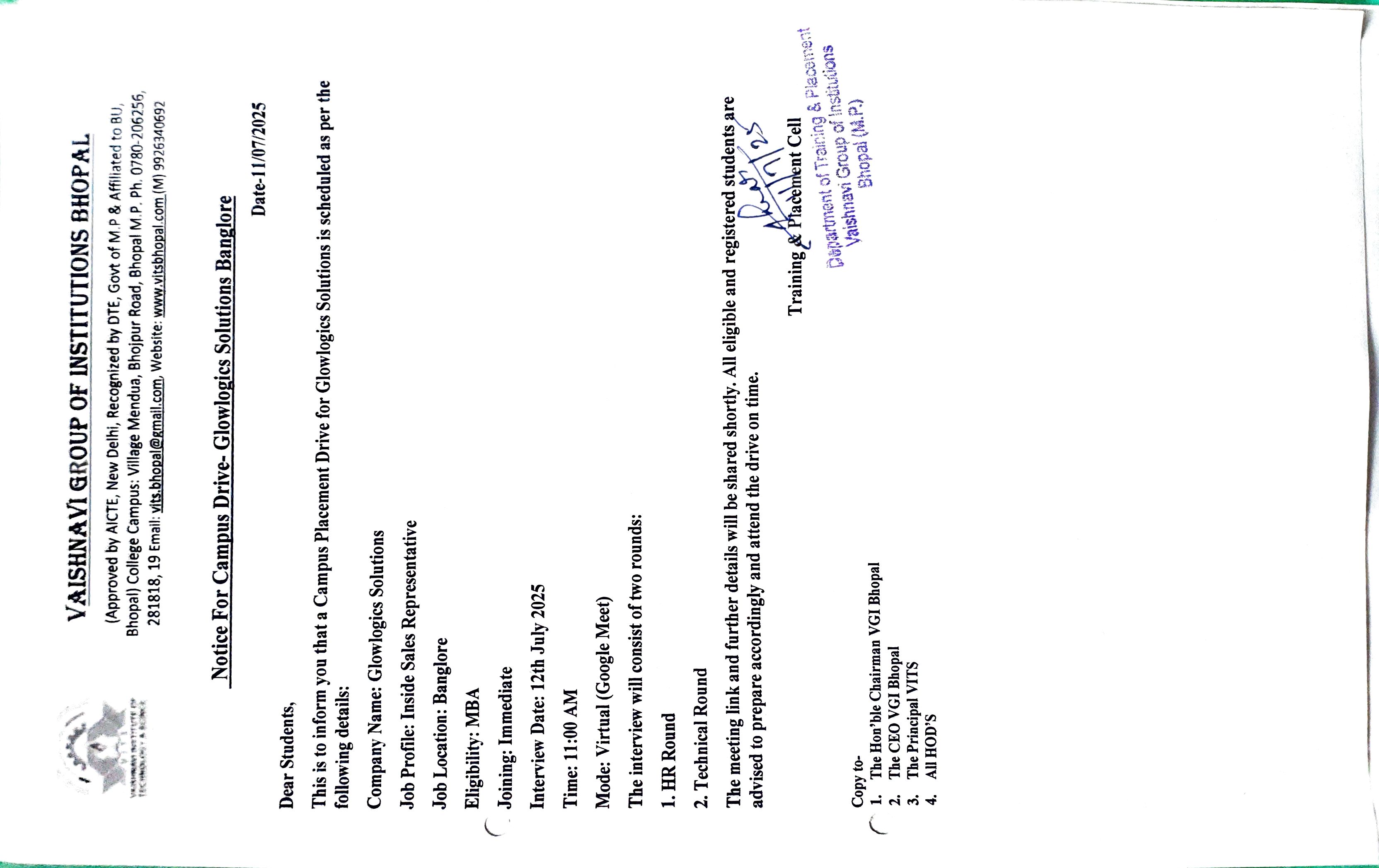 The VGI is officially connected with many Corporate org. & Industries for students practical knowledge betterment and Actual Placements.